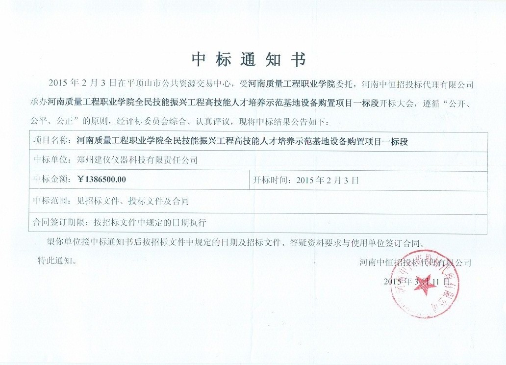 河南質(zhì)量工程職業(yè)技術(shù)學(xué)院PZC2014-9588Ag-46236(一標(biāo)段)中標(biāo)通知書(shū)