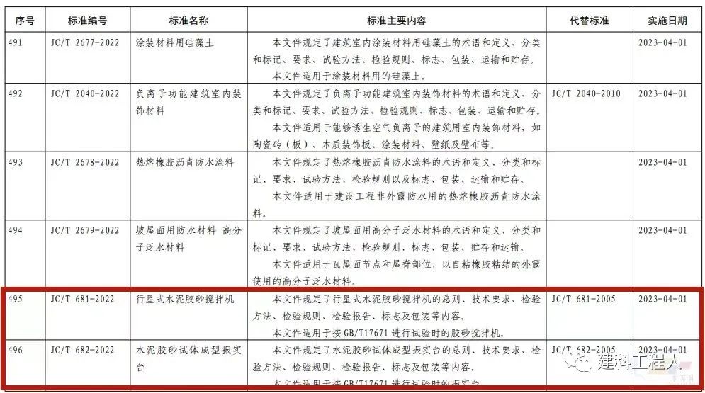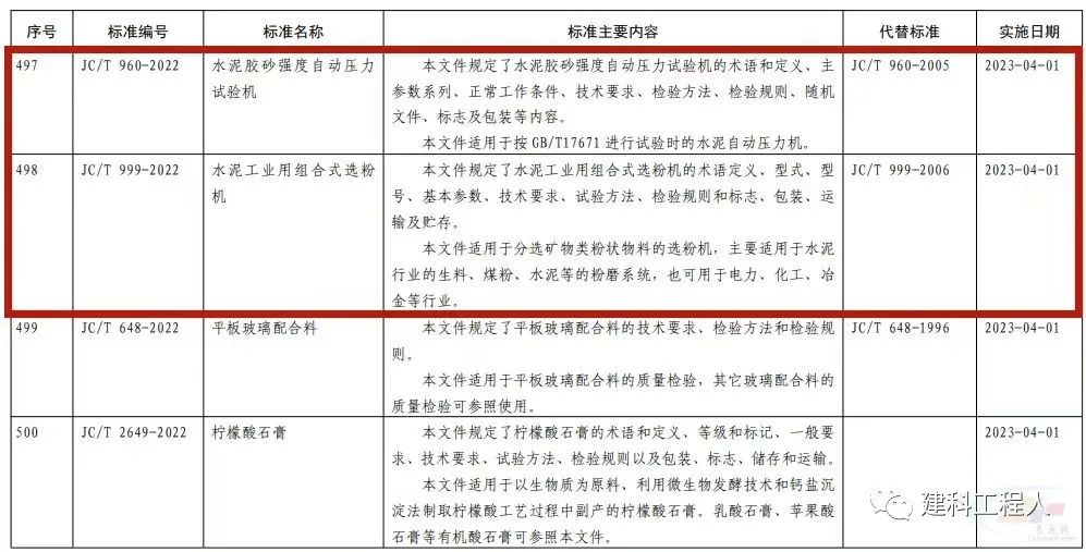 2022年10月20日,中華人民共和國工業和信息化部2022年第23號公告文件批準發布1036項行業標準,其中包含三項水泥膠砂強度檢驗試驗相關設備標準,分別為JC/T 681-2022《行星式水泥膠砂攪拌機》,JC/T 682-2022《水泥膠砂試體成型振實臺》,JC/T 960-2022《水泥膠砂強度自動壓力試驗機》,三項標準將于2023年4月1日實施。